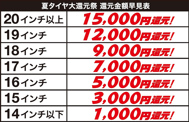 購入するタイヤの税込価格から還元します。20インチ以上/19インチ/18インチ/17インチ/16インチ/15インチ/14インチ以下の4本セット購入で還元額が異なります。