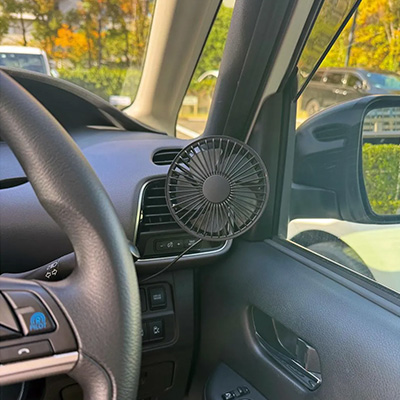 ならばカーエアコンを使用となるのですが、「エアコンの直風は苦手」「男性の快適な温度にすると女性は冷やしすぎで寒い」「後部座席は冷気が届きにくいので暑い」「子供には自然な涼しさを」など、車内エアコンあるあるが問題になることも・・・そんな時にはカーファン=車内用扇風機がおすすめです。