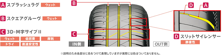 主溝とラグ溝をつなぐことでパタンノイズを低減。車内が静かになり後部座席との会話もスムーズに。